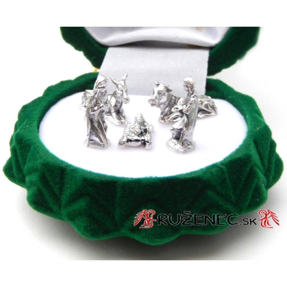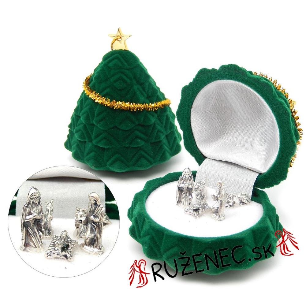 Apró betlehem - fenyőfa forma - plüss ékszerdobozban.Fém figurákkal.Méretek: 6x7 cm.