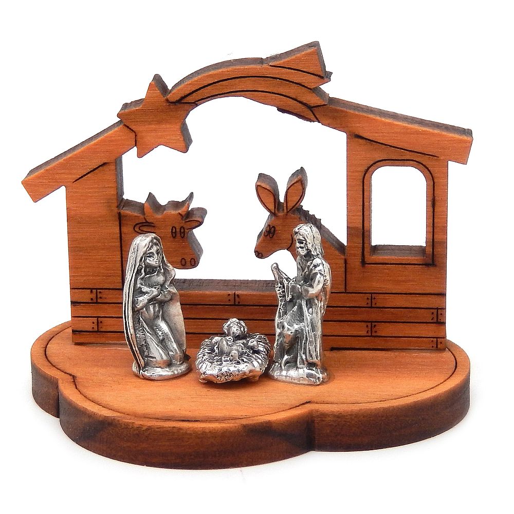 Olivafából faragott betlehem.Fém figurákkal.Méretek: 4x4x5.4cm