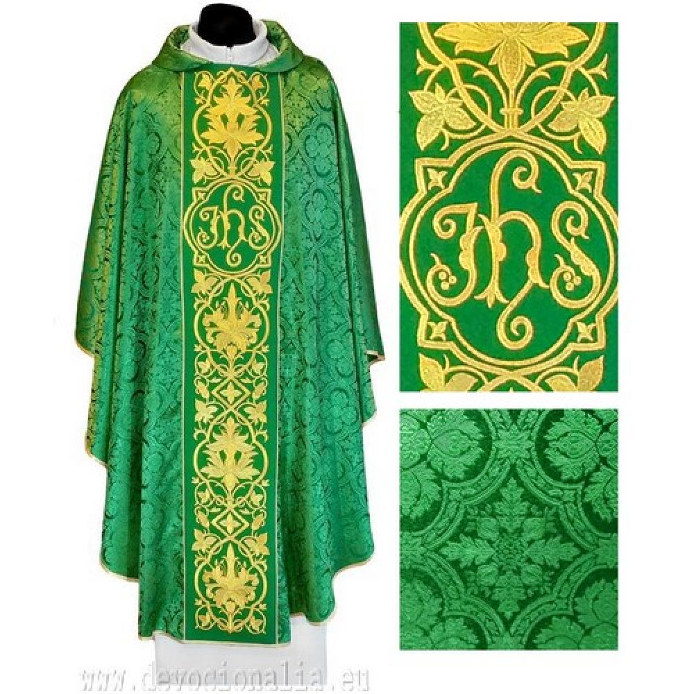 Zöld brokát, gazdagon hímzett miseruha aranyszín díszítéssel.Aranyszín szalaggal körbeszegve.Anyaga: zöld színű, rozetta mintás brokátanyag 100%PES .Méretek.szélesség: 144cm.hossz: 125cm.