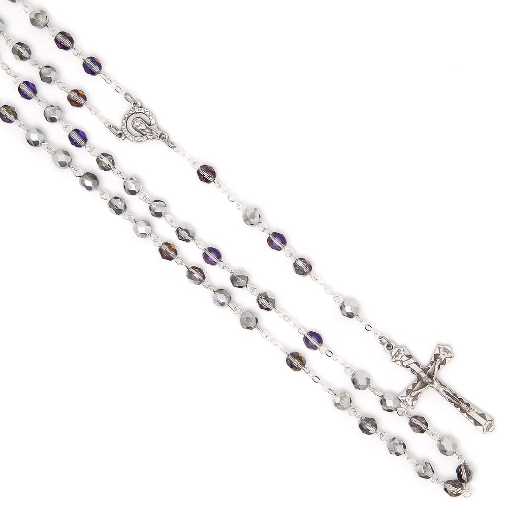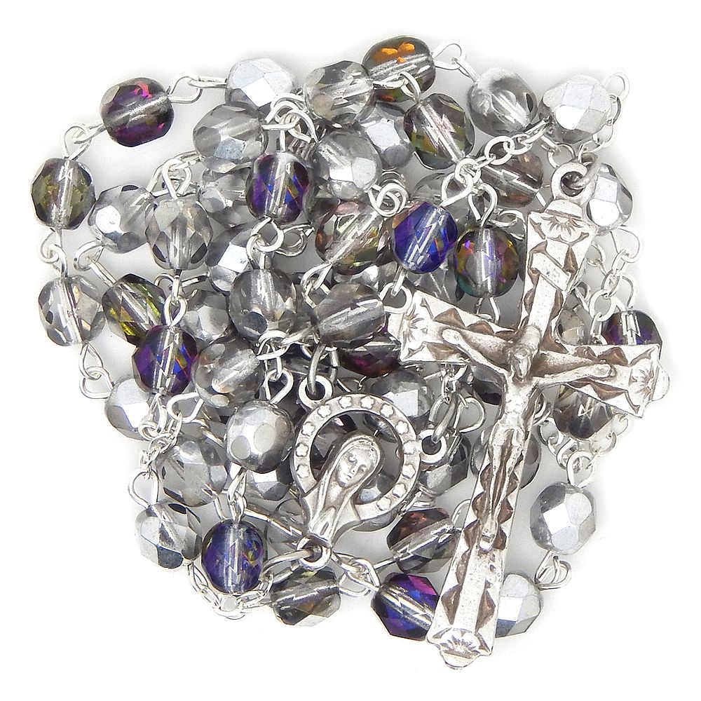 Rózsafüzér - 6mm-es csiszolt áttetsző + kékes+ezüstös csillogó cseh-üveg kristály gyöngyökből.