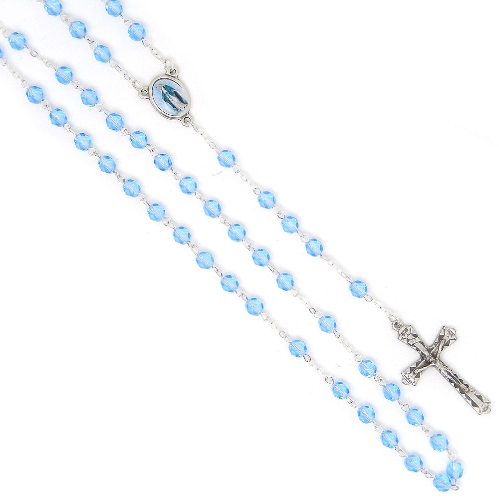 Rózsafüzér - 6mm-es csiszolt csillogó világoskék cseh-üveg kristály gyöngyökből. A rózsafüzér teljes hossza: 48cm, belső kerület: 61m.Kézi kötés, ezüstözött dróttal.